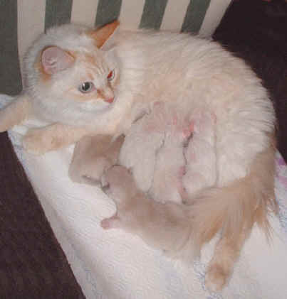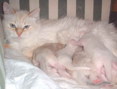die glückliche Mama Iljinka mit den 3 Tage alten Kitten |