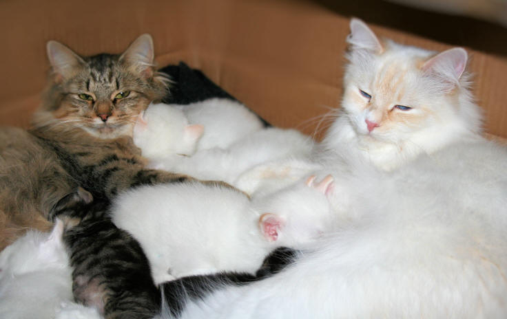 ![]() | bei ihrem ersten Wurf wird Mojito von ihrer Freundin Upsala unterstützt, die auch gerade Kitten hatte |